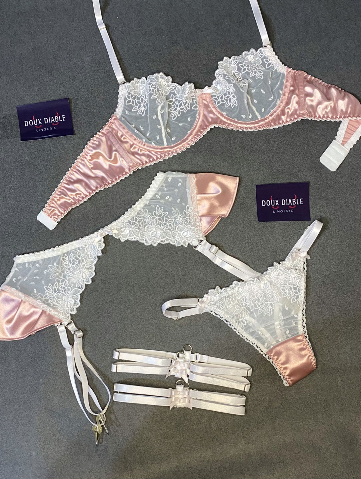 Confeccionado en tul bordado blanco y saten rosa viejoš