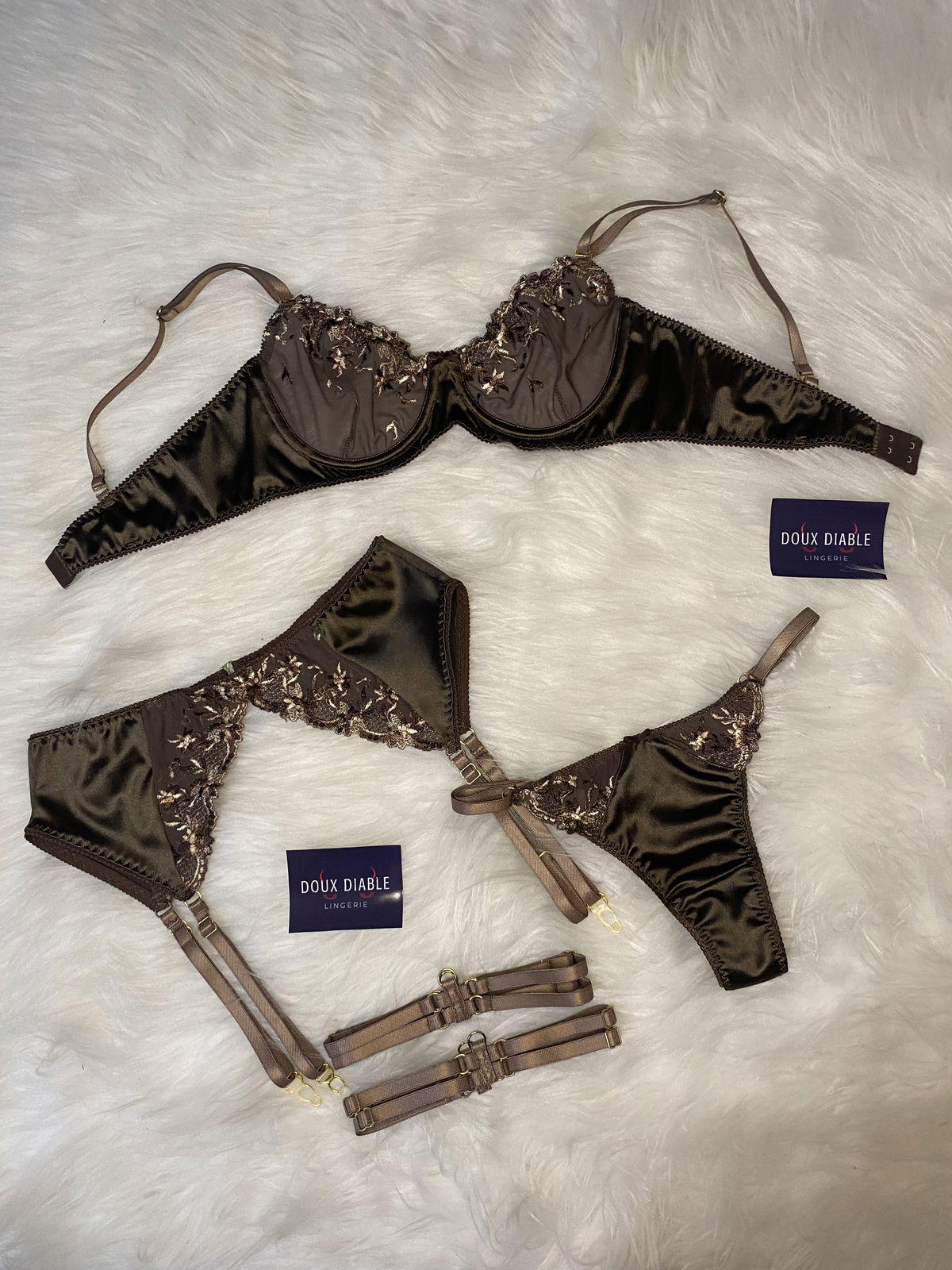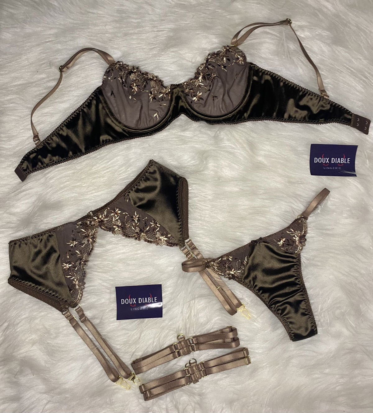 Set confeccionado en saten de punto y tul bordado elastizado 🤎.