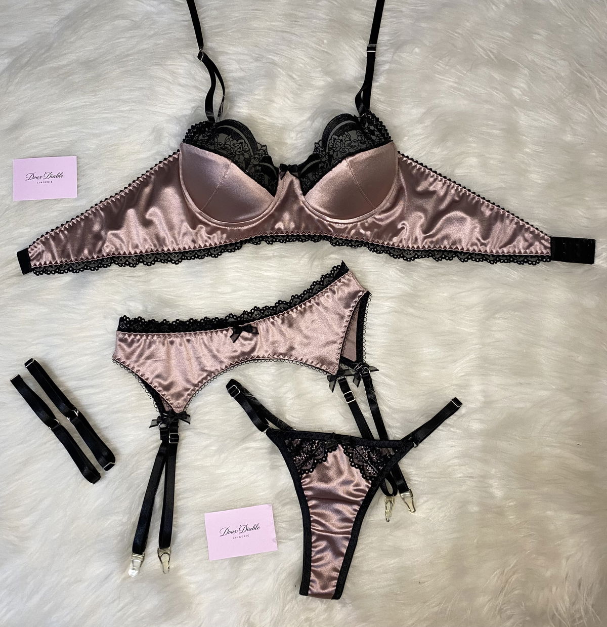 Set confeccionado en saten de punto,tul bordado y puntilla 🖤